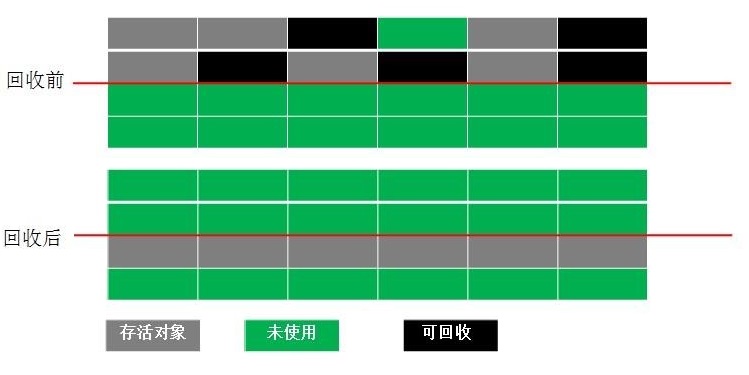 理对象,而是将存活对象移向内存的一端。然后清除端边界外的对象。